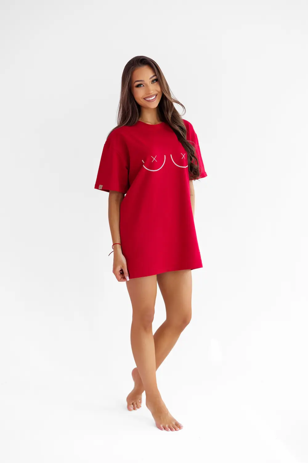 Piżama damska Cherry Mood to wygodny komplet składający się z koszulki oversize z nadrukiem oraz długich spodni z elastycznym pasem i regulowanym sznurkiem. Wykonana z wysokiej jakości bawełny z dodatkiem elastanu (92% bawełna, 8% elastan), zapewnia komfort, oddychalność i swobodę ruchów.