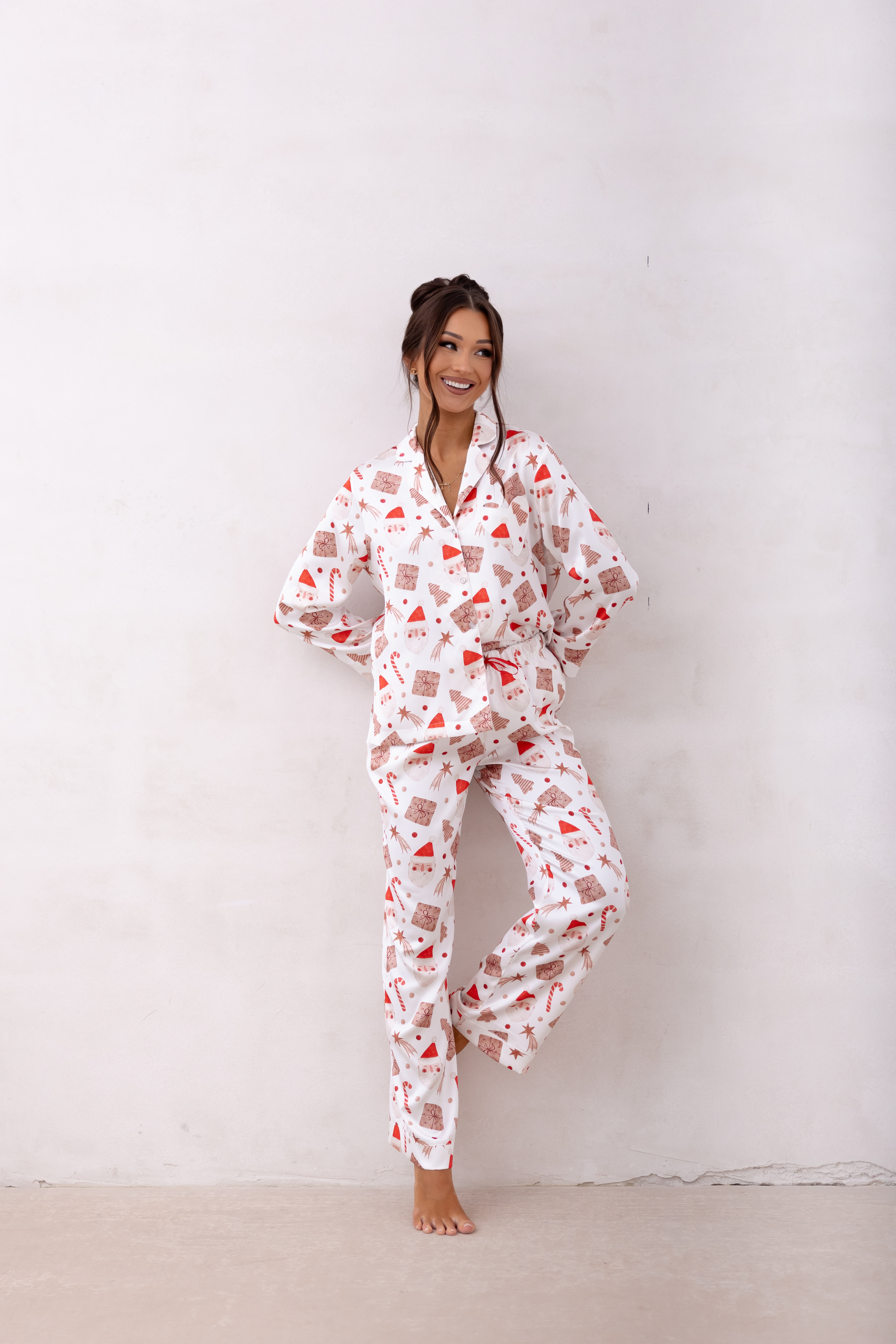 Santa Babe Long to świąteczna piżama satynowa w długiej wersji, idealna na zimowe wieczory. Biały materiał pokryty jest uroczymi świątecznymi printami: Mikołajami, prezentami, gwiazdkami i cukrowymi laskami. Góra piżamy zapinana jest na guziki, a w talii znajduje się delikatne wiązanie na kokardkę, które dodaje całości subtelnego uroku.